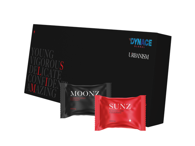 Dynace Urbanisme est composé de 2 bonbons rouge et noir.